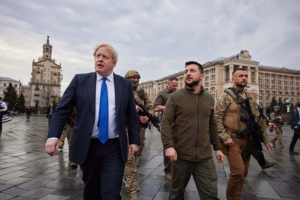 Boris Johnson og Volodymyr Zelenskyj i sentrale Kiev, 9. april 2022